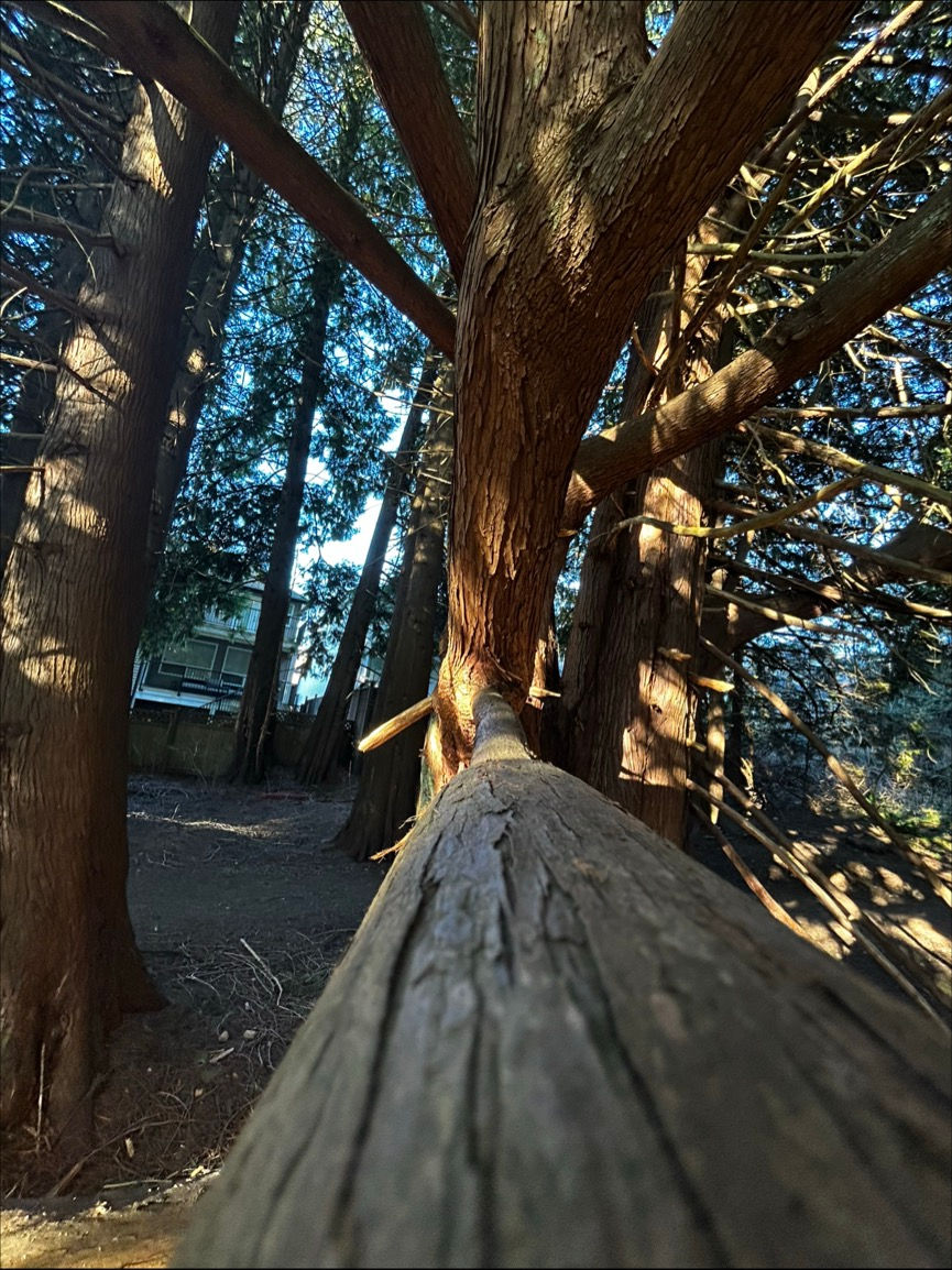 Represents a birds eye view of the world around it, with value from the suns reflection off the tree and the tree barks rough texture all around.